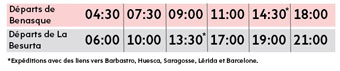 3.- Il n'y a pas de réservation de places sur les services, celles-ci étant soumises à l'ordre d'arrivée et à la capacité de l'autobus. Les usagers ayant acheté un billet aller-retour pour Benasque auront la préférence dans l'ordre d'arrivée par rapport aux passagers ayant acheté un seul billet pour les services Vallibierna - Senarta - Benasque.